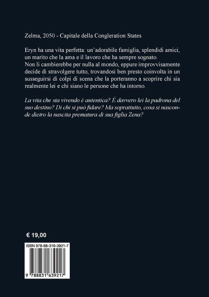 Zelma, 2050 - Capitale della Congleration States Eryn ha una vita perfetta: un'adorabile famiglia, splendidi amici, un marito che la ama e il lavoro che ha sempre sognato. Non li cambierebbe per nulla al mondo, eppure improvvisamente decide di stravolgere tutto, trovandosi ben presto coinvolta in un susseguirsi di colpi di scena che la porteranno a scoprire chisia realmente lei e chi siano le persone che ha intorno. La vita che sta vivendo è autentica? È davvero lei la padrona del suo destino? Di chi si può fidare?Ma soprattutto, cosa si nasconde dietro la nascita prematura di sua figlia Zena?