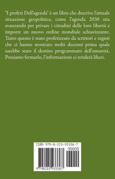 "I profeti dell'agenda" è un libro che descrive l'attuale situazione geopolitica, come l'agenda 2030 stia avanzando per privare i cittadini delle loro libertà e imporre un nuovo ordine mondiale schiavizzante. Tutto questo è stato profetizzato da scrittori e registi che ci hanno mostrato molti decenni prima quale sarebbe stato il destino programmato dell'umanità. Possiamo fermarlo, l'informazione ci renderà liberi.