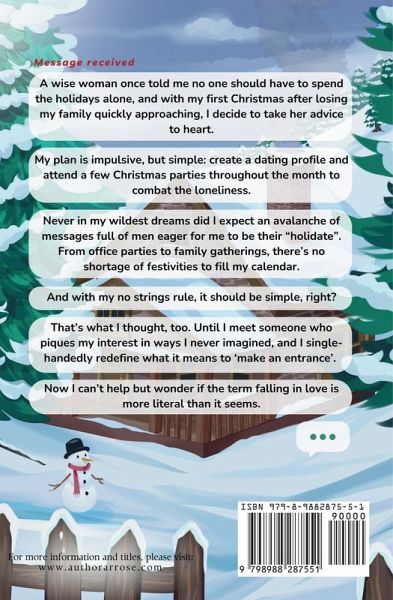 From author A.R. Rose comes a STANDALONE feel good holiday romance with fake dating, found family, and a cat named Potato... A wise woman once told me no one should have to spend the holidays alone, and with my first Christmas after losing my family quickly approaching, I decide to take her advice to heart. My plan is impulsive, but simple: create a dating profile and attend a few Christmas parties throughout the month to combat the loneliness. Never in my wildest dreams did I expect an avalanche of messages full of men eager for me to be their "holidate". From office parties to family gatherings, there's no shortage of festivities to fill my calendar. And with my no strings rule, it should be simple, right? That's what I thought, too. Until I meet someone who piques my interest in ways I never imagined, and I single-handedly redefine what it means to 'make an entrance'. Now I can't help but wonder if the term falling in love is more literal than it seems. Tropes: Holiday Found Family Fake Dating Big City Girl / Small Town Guy He Falls First Cat Bestie Named Potato* *Not a trope, but you're going to love him.