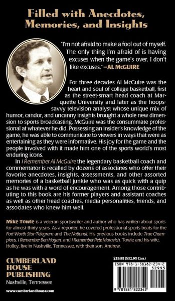 For three decades, Al McGuire was the heart and soul of college basketball, first as the street-smart head coach at Marquette University and later as the hoops-savvy television analyst whose unique mix of humor, candor, and uncanny insights brought a whole new dimension to sports broadcasting. McGuire was the consummate professional at whatever he did. Possessing an impeccable insider's knowledge of the game, he was able to communicate to viewers in ways that were as entertaining as they were informative. He made people laugh, he could laugh at himself, and his joy for the game and people in it made him one of sports' most enduring icons.McGuire passed away at the age of seventy-two in early 2001 after a long illness, leaving behind a basketball-rich legacy that had its poetic qualities as well. Never was that more evident than in the 1976-77 season, when McGuire announced to his team in midseason that it would be his last year in coaching. The season ended with McGuire overcome by emotion, sitting on the Marquette bench with tears streaming down his face as the Warriors gave their beloved coach the ultimate going-away present, a national championship. Thus ended a twenty-year coaching career in which McGuire completed a 405-143 record, including a 295-80 mark at Marquette.In I Remember Al McGuire, the legendary basketball coach and announcer is remembered by dozens of associates, who offer their favorite anecdotes, insights, assessments, and other assorted memories of a basketball junkie as quick with a quip as he was with a word of encouragement. Among those contributing to this book are his former players and assistant coaches as well as other head coaches, media personalities, friends, and associates who knew him well at one time or another in his life