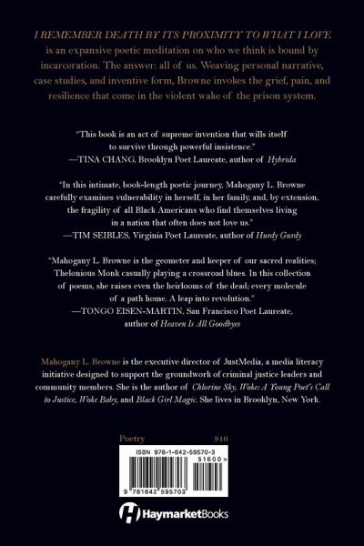 Mahogany L. Browne is the Executive Director of JustMedia, a media literacy initiative designed to support the groundwork of criminal justice leaders and community members. This position is informed by her career as a writer, organizer, and educator. Browne has received fellowships from Agnes Gund, Air Serenbe, Cave Canem, Poets House, Mellon Research, and Rauschenberg. She is the author of recent works: Chlorine Sky, Woke: A Young Poets Call to Justice, Woke Baby, and Black Girl Magic. She is the founder of the diverse lit initiative, Woke Baby Book Fair. I Remember Death By Its Proximity to What I Love responds to the impact of mass incarceration on women and children, and is Browne's latest poetry collection. She lives in Brooklyn, New York.