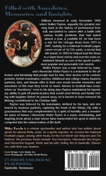This collection of personal memories of Chicago Bears star Walter Payton, who died in November, 1999, is compiled from recollections of those who know Payton best. Illustrated.