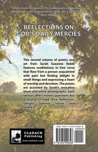 Reflections on God's daily mercies. This second volume of poetry and art from Sarah Suzanne Noble features meditations in free verse that flow from a person acquainted with pain but finding delight in small things and expressing a heart of worship and devotion. The poems are accented by Sarah's evocative black-and-white photographs. Each section offers honest questions but a resolve to hope: Rise, Reflection, Delight, Setback, Savior, and Stillness.