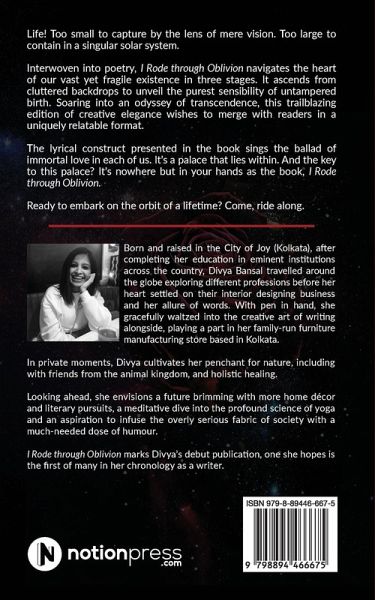 Life! Too small to capture by the lens of mere vision. Too large to contain in a singular solar system. Interwoven into poetry, I Rode through Oblivion navigates the heart of our vast yet fragile existence in three stages. It ascends from cluttered backdrops to unveil the purest sensibility of untampered birth. Soaring into an odyssey of transcendence, this trailblazing edition of creative elegance wishes to merge with readers in a uniquely relatable format. The lyrical construct presented in the book sings the ballad of immortal love in each of us. It's a palace that lies within. And the key to this palace? It's nowhere but in your hands as the book, I Rode through Oblivion. Ready to embark on the orbit of a lifetime? Come, ride along.