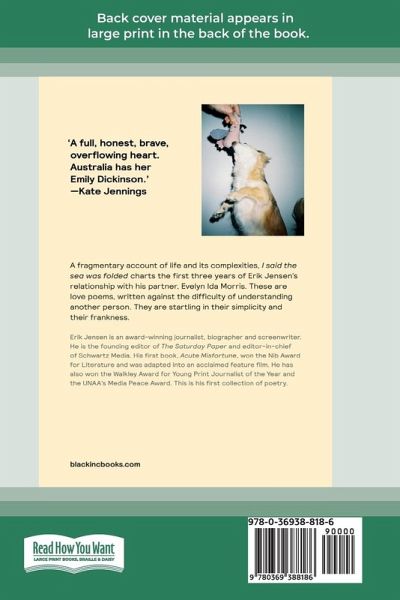 From award-winning writer Erik Jensen comes a tender and involving narrative sequence of short love poems. 'These poems were intended first as gifts. They are the story of falling in love ... and realising that rejecting the gender binary is not one thing: it is everything.' -Erik Jensen A fragmentary account of life and its complexities, I said the sea was folded charts the first three years of Erik Jensen's relationship with his partner, Evelyn Ida Morris. These are love poems, written against the difficulty of understanding another person. They are startling in their simplicity and their frankness.