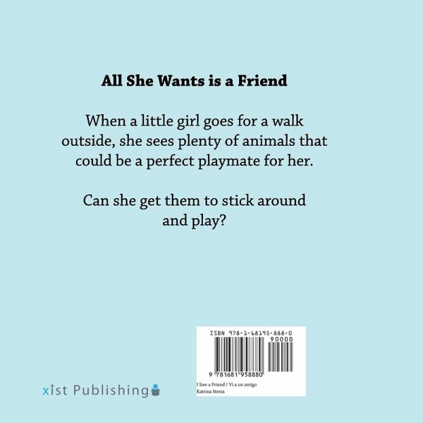 All She Wants is a Friend When a little girl goes for a walk outside, she sees plenty of animals that could be a perfect playmate for her. Can she get them to stick around and play? A fun bilingual picture book in both English and Spanish for preschoolers and other young children with lots of prepositions, perfect for classroom use.