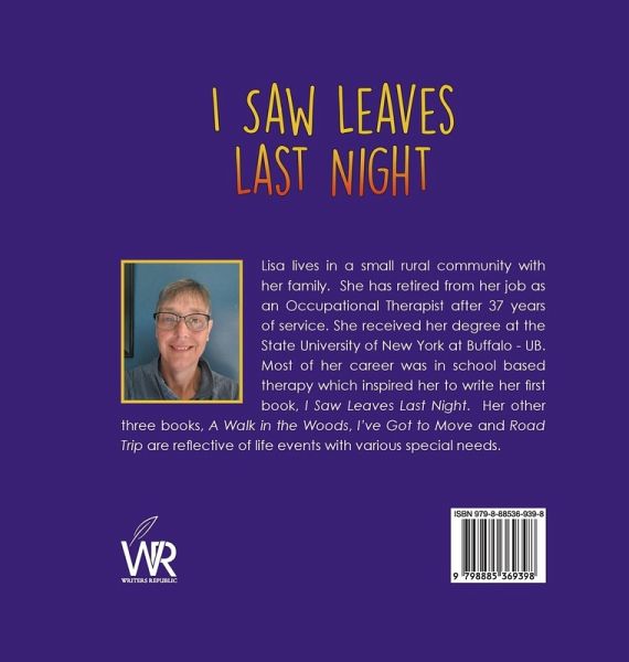 Lisa lives in a small rural community with her family. She has retired from her job as an Occupational Therapist after 37 years of service. She received her degree at the State University of New York at Buffalo - UB. Most of her career was in school based therapy which inspired her to write her first book, I Saw Leaves Last Night. Her other three books, A Walk in the Woods, I've Got to Move and Road Trip are reflective of life events with various special needs.