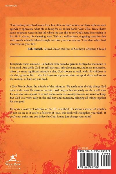 "God is always involved in our lives, but often we don't notice, too busy with our own agenda to appreciate what He is doing for us. In her book I Saw That, Tracie shares some poignant events in her life where she was able to see God's hand interceding in her life in divine, life-changing ways. This is a well-written, engaging narrative that will provide valuable biblical insights on how you, too, can say, 'I saw that' when God intervenes in your life." - Bob Russell, Retired Senior Minister of Southeast Christian Church Everybody wants a miracle-a Red Sea to be parted, a giant to be slayed, a mountain to be moved. And while God can still part seas, take down giants, and move mountains, often the most significant miracle is that God chooses to walk with His children in the daily grind of life ... that He knows our prayers before we speak them and knows the number of hairs on our head. I Saw That is about the miracle of the minutiae. We rarely miss the big things God does or the ways He answers our big, bold prayers, but we rarely see the small ways He cares for us-speaks to us and dances over us-mostly because we aren't looking. But God is at work daily in the ordinary and mundane, bringing all things together for our good. It's never a matter of whether or not He is faithful. It's always a matter of whether or not we see it. If you're a follower of Jesus, this book will strengthen your faith. If you're not quite sure you believe in God, it may just change your mind!