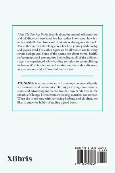 I Saw The Sun Pass By Me Today is about the author's self transition and self discovery. Ayo Sands lets her readers know about how it is to deal with life hard issues and details them throughout the book. The author starts with telling about her life's journey with poetry and spoken word.The author topics are for all women and for every ethnic background. Some of the poems talk about mental health, self awareness and community. She replicates all of the different stages she experienced while battling seclusion to accomplishing inclusion.With inspiration and motivation, the author discovers new aspirations and self love,and you can too.