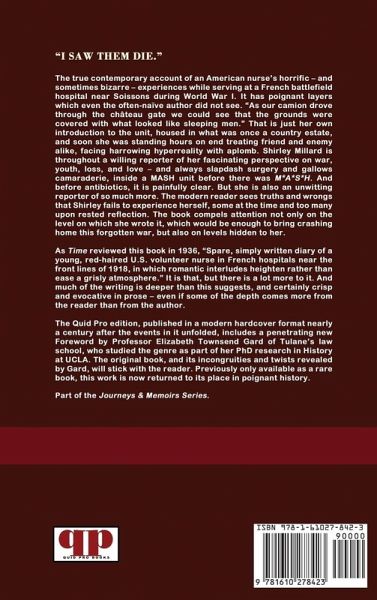 Now in a library-quality hardcover edition with a modern, legible presentation, this is a true contemporary account of an American nurse's horrific - and sometimes bizarre - experiences while serving at a French battlefield hospital near Soissons during World War I. It has poignant layers which even the oft-naive author did not see. "As our camion drove through the château gate we could see that the grounds were covered with what looked like sleeping men." That is just her own introduction to the unit, housed in what was once a country estate, and soon she was standing hours on end treating friend and enemy alike, facing harrowing hyperreality with aplomb. ¿ Shirley Millard is throughout a willing reporter of her fascinating perspective on war, youth, loss, and love - and always slapdash surgery and gallows camaraderie, inside a MASH unit before there was M*A*S*H. And before antibiotics, it is painfully clear. But she is also an unwitting reporter of so much more. The modern reader sees truths and wrongs that Shirley fails to experience herself, some at the time and too many upon rested reflection. The book compels attention not only on the level on which she wrote it, which would be enough to bring crashing home this forgotten war, but also on levels hidden to her. Either way the insights pierce through, as when the young French doctor sums up war: "La gloire, la gloire! Bah! C'est de la merde!" He is a hero too, but has his own incongruous scenes later, just in his smoking habits alone. ¿ This collection of diary entries and later flashbacks may be the second greatest personal account of World War I, behind that by the much more self-aware Erich Remarque (though readers here may find themselves drawn into the lack of awareness as much as the account itself). Yet this book seems to have been lost in time and the crush of later events. As TIME reviewed it in 1936, "Spare, simply written diary of a young, red-haired U.S. volunteer nurse in French hospitals near the front lines of 1918, in which romantic interludes heighten rather than ease a grisly atmosphere." It is that, but there is a lot more to it. And much of the writing is deeper than that, and certainly crisp and evocative in prose, even if some of the depth is more for the reader than the author. ¿ Includes penetrating new Foreword by Professor Elizabeth Townsend Gard, who studied the genre as part of her PhD research in History at UCLA. The original book, and its incongruities and twists revealed by Gard, will stick with the reader. Previously only available as a rare book, this work is now returned to its place in poignant history, and now published in a hardcover edition. ¿ POSSIBLE USES IN SCHOOLS: This book, though listed as targeted at college adults, will have as its principal audience the general reader and young adults. It would be an excellent, fairly brief book to assign to classes in High School and possibly Middle School. Although some of its scenes are stark and upsetting, and one would be cautioned to have YAs read it much as would be true of the candor of All Quiet on the Western Front, it has no other aspects which would make it inappropriate for minors and allows excellent discussions of war, class, race, nationalism, medicine, unsung women in war, foreshadowing and subtext, and many other themes that the author herself did not mean to raise. In other words, since the writer speaks on one level, and does not realize the other levels she touches, it would help to develop readers' critical skills to share their opinions about what she is missing in her own text. And in the process there will be no concern that the book would be inappropriate for YAs except that some of the medical and casualty moments are, of course, brutal. Also available in paperback and digital formats from Quid Pro Books.