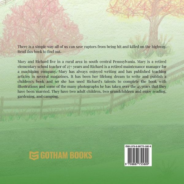 There is a simple way all of us can save raptors from being hit and killed on the highway. Read this book to find out. Mary and Richard live in a rural area in south central Pennsylvania. Mary is a retired elementary school teacher of 27+ years and Richard is a retired maintenance manager for a machining company. Mary has always enjoyed writing and has published teaching articles in several magazines. It has been her lifelong dream to write and publish a children's book and so she has used Richard's talents to complete the book with illustrations and some of the many photographs he has taken over the 45 years that they have been married. They have two adult children, two grandchildren and enjoy reading, gardening, and camping.