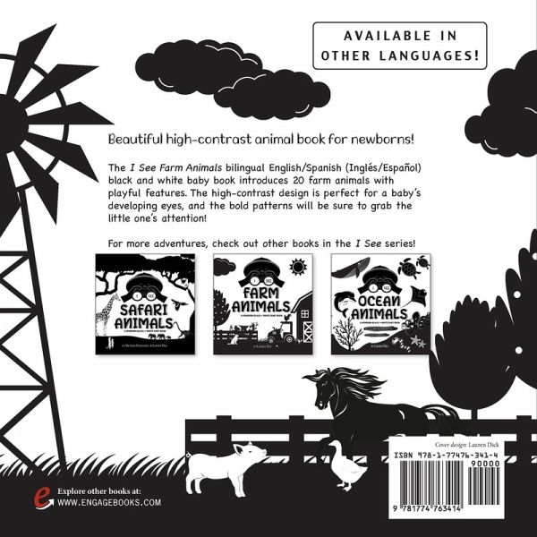 Beautiful high-contrast animal book for newborns! The I See Farm Animals bilingual English/Spanish (Inglés/Español) black and white baby book introduces 20 farm animals with playful features. Help your baby get to know cows, horses, pigs, chickens, donkeys, ducks, gooses, dogs, cats, and more. The high-contrast design is perfect for a baby's developing eyes, and the bold patterns will be sure to grab the little one's attention! For more adventures, check out other books in the I See series!I See Safari Animals I See Farm Animals I See Ocean Animals I See Forest Animals I See Garden Animals I See Zoo Animals