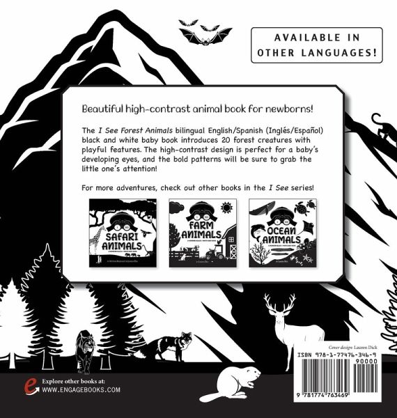 Beautiful high-contrast animal book for newborns! The I See Forest Animals bilingual English/Spanish (Inglés/Español) black and white baby book introduces 20 forest creatures with playful features. Help your baby get to know bear, moose, deer, cougar, wolf, fox, beaver, skunk, owl, eagle, woodpecker, bat, and more. The high-contrast design is perfect for a baby's developing eyes, and the bold patterns will be sure to grab the little one's attention! For more adventures, check out other books in the I See series!I See Safari Animals I See Farm Animals I See Ocean Animals I See Forest Animals I See Garden Animals I See Zoo Animals