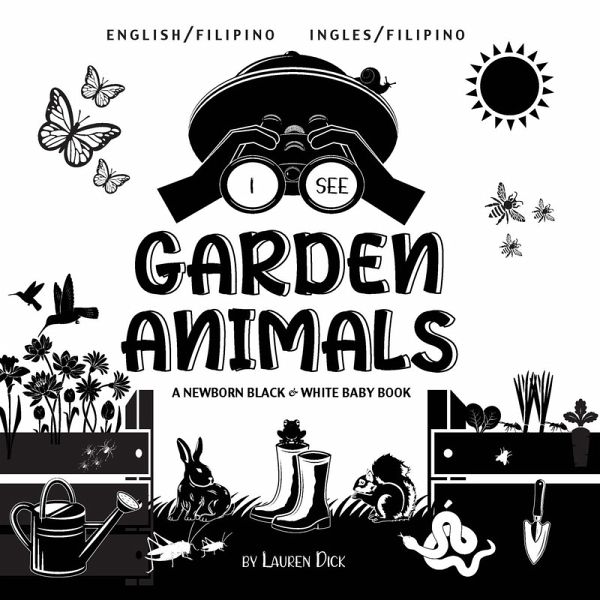 Beautiful high-contrast animal book for newborns! The I See Garden Animals bilingual English/Filipino (Ingles/Filipino) black and white baby book introduces 20 garden creatures with playful features. Help your baby get to know hummingbird, butterfly, dragonfly, snail, bee, spider, snake, frog, mouse, rabbit, mole, and more. The high-contrast design is perfect for a baby's developing eyes, and the bold patterns will be sure to grab the little one's attention! For more adventures, check out other books in the I See series!I See Safari Animals I See Farm Animals I See Ocean Animals I See Forest Animals I See Garden Animals I See Zoo Animals