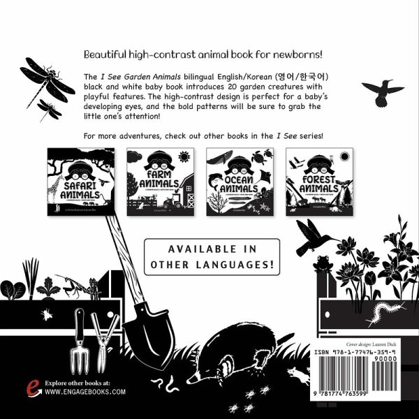 Bilingual English/Korean Baby Book Beautiful high-contrast animal book for newborns! The I See Garden Animals bilingual English/Korean (¿¿/¿¿¿) black and white baby book introduces 20 garden creatures with playful features. Help your baby get to know hummingbird, butterfly, dragonfly, snail, bee, spider, snake, frog, mouse, rabbit, mole, and more. The high-contrast design is perfect for a baby's developing eyes, and the bold patterns will be sure to grab the little one's attention! For more adventures, check out other books in the I See series!I See Safari Animals I See Farm Animals I See Ocean Animals I See Forest Animals I See Garden Animals I See Zoo Animals