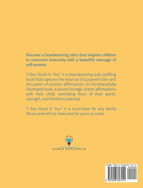 Discover a heartwarming story that inspires children to overcome insecurity with a beautiful message of self-esteem. "I See Good in You" is a heartwarming and uplifting book that captures the essence of a parent's love and the power of positive affirmations. In this beautifully illustrated book, a parent lovingly shares affirmations with their child, reminding them of their worth, strength, and limitless potential. "I See Good in You" is a must-have for any family library and will be treasured for years to come.