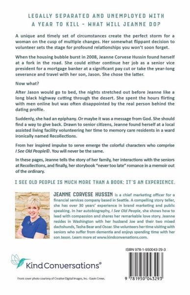 Legally Separated and Unemployed with a Year to Kill - What Will Jeanne Do?¿ A unique and timely set of circumstances create the perfect storm for a woman on the cusp of multiple changes. Her somewhat flippant decision to volunteer sets the stage for profound relationships you won't soon forget. When the housing bubble burst in 2008, Jeanne Corvese Hussin found herself at a fork in the road. She could either continue her job as a senior vice president for a mortgage banker at a significant pay cut or take the year-long severance and travel with her son, Jason. She chose the latter. Now what? After Jason would go to bed, the nights stretched out before Jeanne like a long black highway cutting through the desert. She spent the hours flirting with men online but was often disappointed by the real person behind the dating profile. Suddenly, she had an epiphany. Or maybe it was a message from God. She should find a way to give back. Drawn to senior citizens, Jeanne found herself at a local assisted living facility volunteering her time to memory care residents in a ward ironically named Recollections. From her inspired impulse to serve emerge the colorful characters who comprise I See Old People(c). You will never be the same. In these pages, Jeanne tells the story of her family, her interactions with the seniors at Recollections, and finally, her storybook "never too late" romance in this extraordinary memoir. I See Old People is much more than a book; it's an experience.
