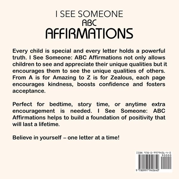 Every child is special and every letter holds a powerful truth. I See Someone: ABC Affirmations not only allows children to see and appreciate their unique qualities but it encourages them to see the unique qualities of others. From A is for Amazing to Z is for Zealous, each page encourages kindness, boosts confidence and fosters acceptance. Perfect for bedtime, story time, or anytime extra encouragement is needed. I See Someone: ABC Affirmations helps to build a foundation of positivity that will last a lifetime. Believe in yourself - one letter at a time.