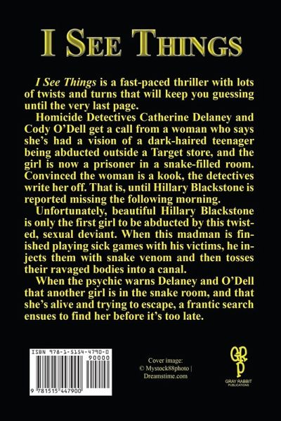 I See Things is a fast-paced thriller with lots of twists and turns that will keep you guessing until the very last page. Homicide Detectives Catherine Delaney and Cody O'Dell get a call from a woman who says she's had a vision of a dark-haired teenager being abducted outside a Target store, and the girl is now a prisoner in a snake-filled room. Convinced the woman is a kook, the detectives write her off. That is, until Hillary Blackstone is reported missing the following morning. Unfortunately, beautiful Hillary Blackstone is only the first girl to be abducted by this twisted, sexual deviant. When this madman is finished playing sick games with his victims, he injects them with snake venom and then tosses their ravaged bodies into a canal. When the psychic warns Delaney and O'Dell that another girl is in the snake room, and that she's alive and trying to escape, a frantic search ensues to find her before it's too late.
