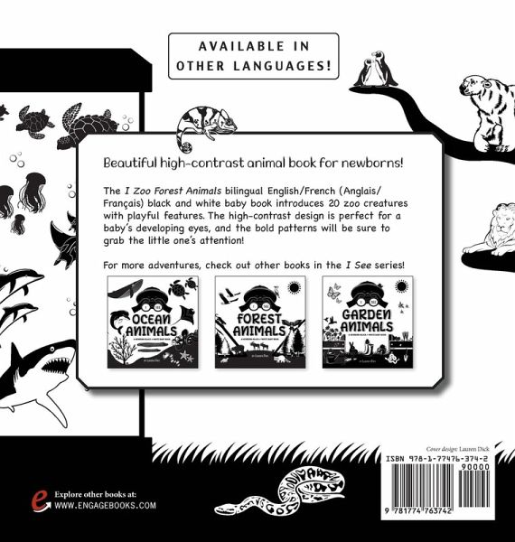 Beautiful high-contrast animal book for newborns! The I See Zoo Animals bilingual English/French (Anglais/Français) black and white baby book introduces 20 zoo creatures with playful features. Help your baby get to know pandas, koalas, sloths, monkeys, kangaroos, giraffes, elephants, lions, tigers, chameleons, sharks, dolphins, turtles, penguins, polar bears, and more. The high-contrast design is perfect for a baby's developing eyes, and the bold patterns will be sure to grab the little one's attention! For more adventures, check out other books in the I See series!I See Safari Animals I See Farm Animals I See Ocean Animals I See Forest Animals I See Garden Animals I See Zoo Animals