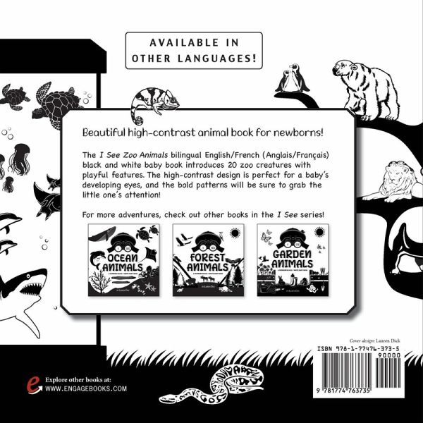 Beautiful high-contrast animal book for newborns! The I See Zoo Animals bilingual English/French (Anglais/Français) black and white baby book introduces 20 zoo creatures with playful features. Help your baby get to know pandas, koalas, sloths, monkeys, kangaroos, giraffes, elephants, lions, tigers, chameleons, sharks, dolphins, turtles, penguins, polar bears, and more. The high-contrast design is perfect for a baby's developing eyes, and the bold patterns will be sure to grab the little one's attention! For more adventures, check out other books in the I See series!I See Safari Animals I See Farm Animals I See Ocean Animals I See Forest Animals I See Garden Animals I See Zoo Animals