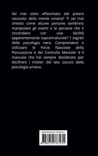 Sei mai stato affascinato dal potere nascosto della mente umana? Ti sei mai chiesto come alcune persone sembrino manipolare gli eventi e le persone che li circondano con una facilità apparentemente soprannaturale? 'I segreti della psicologia nera: Comprendere e Utilizzare le Forze Nascoste della Persuasione e del Controllo Mentale' è il manuale che hai sempre desiderato per decifrare i misteri del lato oscuro della psicologia umana.