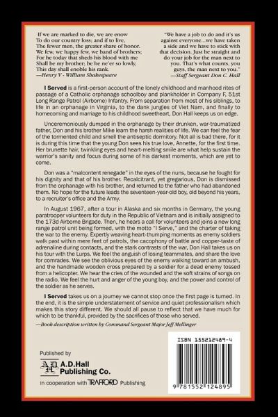I SERVED was written differently from most other Vietnam memoirs. Instead of being a chronological recitation of my experiences growing up in the orphanage and then going to Vietnam and serving with Co. F, 51st Long Range Patrol (Airborne) Infantry, I made its focus be the characters in the story. That is its greatest strength and what makes it such a good read. Because I focused so closely on character, you really get to care about the person Don Hall because you know what makes him tick, what is important to him, and what drives him. You are also engaged by the other people you meet in the story because they are so clearly drawn. You don't have to be a military buff to enjoy the book. I SERVED is a factual story backed up by official U.S. Army records. Col. William C. Maus, the man who formed F/51st LRP, told me where to find that documentation. I also have copies of handouts we received when we went to Recondo School. Before he died, he told me how much he enjoyed reading the book. He praised me for having written such a great story about a unit he was proud to have commanded. He was a visionary who knew our unit was the vanguard for future U.S. Army military strategy and tactics. I remember his telling me at the time that F/51st LRP was making history. Being just a naïve 19-year-old staff sergeant, I didn't understand the significance of that statement. I do now. The current print and ebook versions of I SERVED are a second edition to the original 1994 hardbound edition, with a revised preface and afterword, a new War Stories section (with stories from other men with whom I served), and new photographs