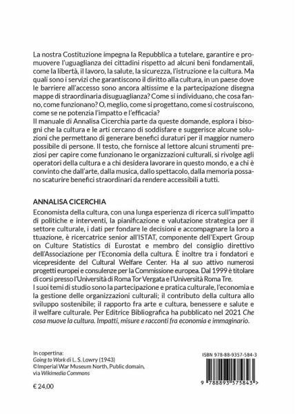 La nostra Costituzione impegna la Repubblica a tutelare, garantire e promuovere l'uguaglianza dei cittadini rispetto ad alcuni beni fondamentali, come la libertà, il lavoro, la salute, la sicurezza, l'istruzione e la cultura. Ma quali sono i servizi che garantiscono il diritto alla cultura, in un paese dove le barriere all'accesso sono ancora altissime e la partecipazione disegna mappe di straordinaria disuguaglianza? Come si individuano, che cosa fanno, come funzionano? O, meglio, come si progettano, come si costruiscono, come se ne potenzia l'impatto e l'efficacia? Il manuale di Annalisa Cicerchia parte da queste domande, esplora i bisogni che la cultura e le arti cercano di soddisfare e suggerisce alcune soluzioni che permettano di generare benefici duraturi per il maggior numero possibile di persone. Il testo, che fornisce al lettore alcuni strumenti preziosi per capire come funzionano le organizzazioni culturali, si rivolge agli operatori della cultura e a chi desidera lavorare in questo mondo, e a chi è convinto che dall'arte, dalla musica, dallo spettacolo, dalla memoria possano scaturire benefici straordinari da rendere accessibili a tutti.