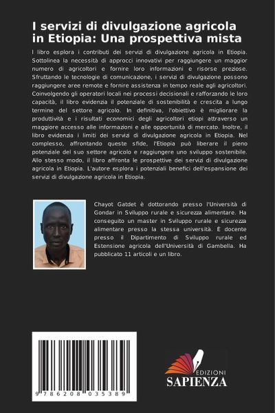 l libro esplora i contributi dei servizi di divulgazione agricola in Etiopia. Sottolinea la necessità di approcci innovativi per raggiungere un maggior numero di agricoltori e fornire loro informazioni e risorse preziose. Sfruttando le tecnologie di comunicazione, i servizi di divulgazione possono raggiungere aree remote e fornire assistenza in tempo reale agli agricoltori. Coinvolgendo gli operatori locali nei processi decisionali e rafforzando le loro capacità, il libro evidenzia il potenziale di sostenibilità e crescita a lungo termine del settore agricolo. In definitiva, l'obiettivo è migliorare la produttività e i risultati economici degli agricoltori etiopi attraverso un maggiore accesso alle informazioni e alle opportunità di mercato. Inoltre, il libro evidenzia i limiti dei servizi di divulgazione agricola in Etiopia. Nel complesso, affrontando queste sfide, l'Etiopia può liberare il pieno potenziale del suo settore agricolo e raggiungere uno sviluppo sostenibile. Allo stesso modo, il libro affronta le prospettive dei servizi di divulgazione agricola in Etiopia. L'autore esplora i potenziali benefici dell'espansione dei servizi di divulgazione agricola in Etiopia.