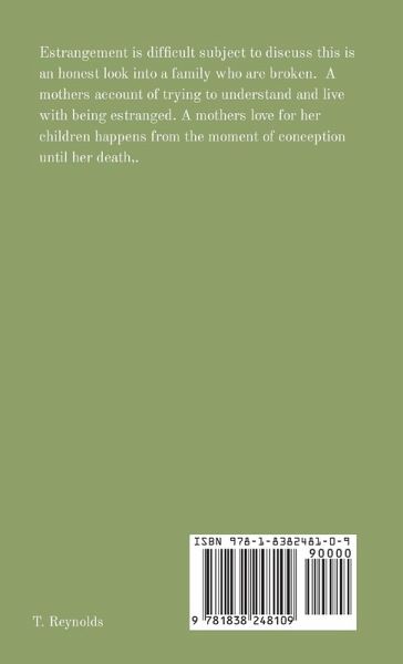 Estrangement is a difficult subject to discuss. This is an honest look into a family who are broken. A mother's account of trying to understand and live with being estranged from both her children. A mother's love for her children happens from the moment of conception until her death.