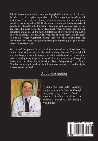I Shall Impersonate a Man is an autobiographical look of the life of James W. Morris, Jr. It is captivating to observe his 74 years of traveling the world first as an Army brat in a family of seven, studying and becoming an architect, maturing to be a 5th Grade school teacher and finally as a retired grandfather. Insights into the family dynamics and personal trials as he experienced moving from city to city, school system to school system both enlightens and points up the myriad differences of growing up in the 1950's and 60's as compared to today. His vignettes of being married in the early 70's to his college sweetheart, raising their two children and then the adventures that come with grandchildren give interesting insights to this period of American life. His use of the phrase "it was a different time" rings throughout his humorous writing as one sees the world through his lens. This insightful read is a book you are able to enjoy, set aside and then pick up at any time and be quickly caught up in the swirl of a boy growing up through an innocent yet turbulent time in American history. Paraphrasing Ferrol Sams, "[Jimbo] senses a quiet and constant flow toward maturity" ... and he fights it every step of the way!