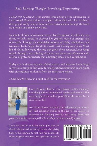 Real. Riveting. Thought-Provoking. Empowering. My Extraordinary Journey from Trauma to Triumph I Shall Not Be Moved is the curated chronicling of the adolescence of Leah Angel Daniel amidst a complex relationship with her mother, a disengaged family composition, and her matriculation through the foster care system in Buffalo, New York. In search of hope to overcome every obstacle against all odds, she was forced to look inward to discover her greatest source of strength and self-worth. Through an undeniable journey of trials, tribulations, and triumphs, Leah Angel dispels the myth that life happens to us. Much like the lotus flower and the rose that grows from concrete, Leah Angel reveals through a vast offering of stories, anecdotes, and affirmations the essence of grit, and tenacity that ultimately leads to self-actualization. Today, as a business strategist, global speaker and advocate Leah Angel serves as a champion and voice for marginalized communities and youth with an emphasis on alumni from the foster care system. I Shall Not Be Moved is a must-read for the overcomer.