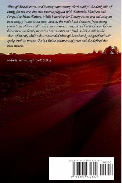She's sick of her job, bored to death and hungry for a new career. Her aging parents need her more than ever. She cares for both, but often doesn't know what to do. Author and poet Terri Lyons chronicles her story of pain and transcendence in this compelling diary of love. Through the storms and looming uncertainty, Terri walked the dark mile caring for not one, but both parents plagued with dementia, blindness and congestive heart failure. While balancing her literary career and enduring an increasingly insane work environment, she made hard decisions from strong convictions of love and loyalty. Her despair strengthened her resolve to follow her conscience deeply rooted in her ancestry and faith. Walk a mile in the shoes of an only child who transcended heartbreak and grief and who spoke truth to power. Sharing her pain and frustration became a part of her healing and her desire to inspire others. She is a living testament of grace and defined her own success. Visit the website www.nightowl5869.net