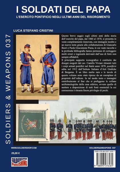 Questo breve saggio sugli ultimi anni della storia dell'esercito del Papa, dal 1860 al 1870, si presenta in veste completamente rinnovata, con immagini inedite e un nuovo testo grazie alla collaborazione di Giancarlo Boeri e Paolo Giacomone Piana, le cui vaste raccolte e la profonda bibliografia hanno permesso di correggere molti errori e ingenuità derivanti dall'uso di fonti non sempre affidabili. Il principale supporto iconografico è costituito dai disegni eseguiti dal cav. Camillo Viviani ritraenti tutti i corpi armati pontifici nel fatale anno 1870 pontificie edita nel 1912 dall'Istituto Italiano d'Arti Grafiche di Bergamo. È un libro molto raro e le tavole di questo volume sono state riprese da un esemplare di proprietà dell'editore. In tal modo testo e immagini contribuiscono al fine che si prefiggono le collane uniformologiche della casa editrice: mettere a disposizione di tutti fonti essenziali la cui conoscenza è rimasta finora privilegio di pochi.