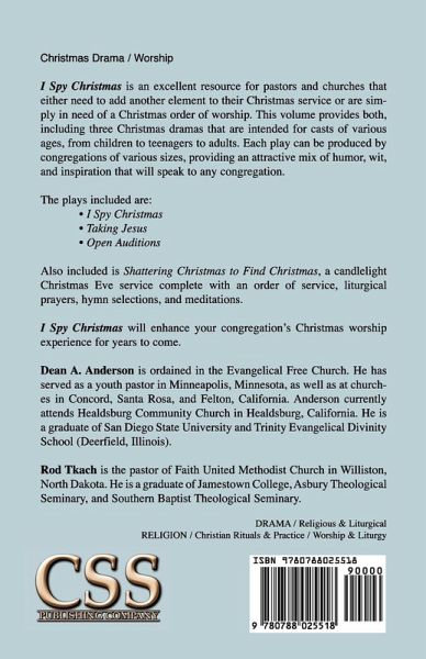 I Spy Christmas is an excellent resource for pastors and churches that either need to add another element to their Christmas service or are simply in need of a Christmas order of worship. This volume provides both, including three Christmas dramas that are intended for casts of various ages, from children to teenagers to adults. Each play can be produced by congregations of various sizes, providing an attractive mix of humor, wit, and inspiration that will speak to any congregation. The plays included are: ¿ I Spy Christmas ¿ Taking Jesus ¿ Open Auditions Also included is Shattering Christmas to Find Christmas, a candlelight Christmas Eve service complete with an order of service, liturgical prayers, hymn selections, and meditations. I Spy Christmas will enhance your congregation's Christmas worship experience for years to come. Dean A. Anderson is ordained in the Evangelical Free Church, and he has served as a youth pastor in Minneapolis, Minnesota, as well as at churches in Concord, Santa Rosa, and Felton, California. Anderson currently attends Healdsburg Community Church in Healdsburg, California. He is a graduate of San Diego State University and Trinity Evangelical Divinity School(Deerfield, Illinois). Rod Tkach is the pastor of Faith United Methodist Church in Williston, North Dakota. He is a graduate of Jamestown College, Asbury Theological Seminary, and Southern Baptist Theological Seminary.