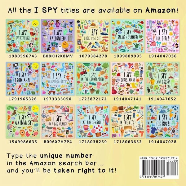 Can you spot the object that begins with B? How about the animal that begins with H? You'll soon discover in this super fun game, I Spy - Inside! Each puzzle focuses on a different letter of the alphabet - all you need to do is find the one item that matches, then turn the page and see whether you've chosen correctly! The puzzles in this book are also arranged in alphabetical order to help little ones learn the A to Z. A perfect book for little learners. They'll develop observational skills, learn to assign letters to objects, and they'll be having so much fun they won't even know they're learning!