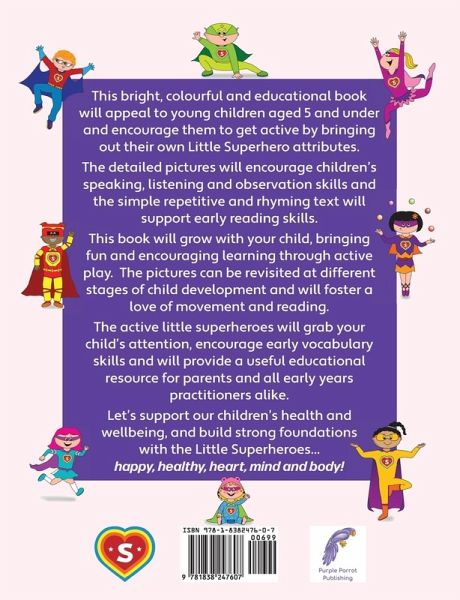 This bright, colourful and educational book will appeal to young children aged 5 and under and encourage them to get active by bringing out their own Little Superhero attributes. The detailed pictures will encourage children's speaking, listening and observation skills and the simple repetitive and rhyming text will support early reading skills. This book will grow with your child, bringing fun and encouraging learning through active play. The pictures can be revisited at different stages of child development and will foster a love of movement and reading. The active little superheroes will grab your child's attention, encourage early vocabulary skills and will provide a useful educational resource for parents and all early years' practitioners alike. Let's support our children's health and wellbeing and build strong foundations with the Little Superheroes... happy, healthy, heart, mind and body!