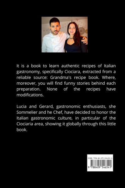 Authentic recipes for Italian food lovers. Stories of grandparents and grandchildren, Italian pasta recipes handed down from generation to generation, from family to family. It is a book to learn authentic recipes of Italian gastronomy, specifically Ciociara, extracted from a reliable source: Grandma's recipe book. Where, moreover, you will find funny stories behind each preparation. None of the recipes have modifications. Lucia and Gerard, gastronomic enthusiasts, she Sommelier and he Chef, have decided to honor the Italian gastronomic culture, in particular of the Ciociaria area, showing it globally through this little book.