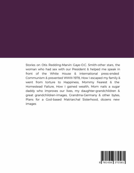 Stories on Otis Redding-Marvin Gaye-O.C. Smith-other stars, the woman who had sex with our President & helped me speak in front of the White House & international press-ended Communism & prevented WWIII-1978, How I escaped my family & went from torture to Happiness, Mommy Fearest & the Homestead Failure, How I gained wealth, Mom nails a sugar daddy who improves our lives, my daughter-grandchildren & great grandchildren-images, Grandma-Germany & other bytes, Plans for a God-based Matriarchal Sisterhood, dozens new images
