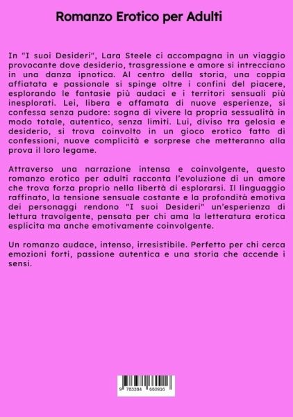 In "I suoi Desideri", Lara Steele ci accompagna in un viaggio provocante dove desiderio, trasgressione e amore si intrecciano in una danza ipnotica. Al centro della storia, una coppia affiatata e passionale si spinge oltre i confini del piacere, esplorando le fantasie più audaci e i territori sensuali più inesplorati. Lei, libera e affamata di nuove esperienze, si confessa senza pudore: sogna di vivere la propria sessualità in modo totale, autentico, senza limiti. Lui, diviso tra gelosia e desiderio, si trova coinvolto in un gioco erotico fatto di confessioni, nuove complicità e sorprese che metteranno alla prova il loro legame.Attraverso una narrazione intensa e coinvolgente, questo romanzo erotico per adulti racconta l'evoluzione di un amore che trova forza proprio nella libertà di esplorarsi. Il linguaggio raffinato, la tensione sensuale costante e la profondità emotiva dei personaggi rendono "I suoi Desideri" un'esperienza di lettura travolgente, pensata per chi ama la letteratura erotica esplicita ma anche emotivamente coinvolgente.Un romanzo audace, intenso, irresistibile. Perfetto per chi cerca emozioni forti, passione autentica e una storia che accende i sensi.