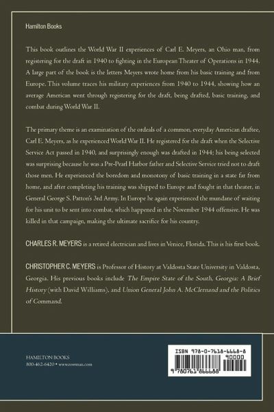 This book outlines the World War II experiences of Carl E. Meyers, an Ohio man, from registering for the draft in 1940 to fighting in the European Theater of Operations in 1944. A large part of the book is the letters Meyers wrote home from his basic training and from Europe. This volume traces his military experiences from 1940 to 1944, showing how an average American went through registering for the draft, being drafted, basic training, and combat during World War II. The primary theme is an examination of the ordeals of a common, everyday American draftee, Carl E. Meyers, as he experienced World War II. He registered for the draft when the Selective Service Act passed in 1940, and surprisingly enough was drafted in 1944; his being selected was surprising because he was a Pre-Pearl Harbor father and Selective Service tried not to draft those men. He experienced the boredom and monotony of basic training in a state far from home, and after completing his training was shipped to Europe and fought in that theater, in General George S. Patton's 3rd Army. In Europe he again experienced the mundane of waiting for his unit to be sent into combat, which happened in the November 1944 offensive. He was killed in that campaign, making the ultimate sacrifice for his country.