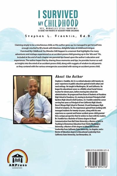 Claiming simply to be a mischievous child, as this author grew up, he managed to get himself into enough mischief to fill a book with hilarious, delightful tales of childhood intrigue. I Survived My Childhood: Yes, Miracles Still Happen!! is a memoir that highlights the many adventures and mishaps experienced as an accident-prone child growing up in the '60s and '70s. Included at the end of each chapter are parental tips based upon the author's education and experiences. The author hopes that by sharing these memories and tips, he provides humor as well as insights into the mind of an accident-prone child, along with nuggets of wisdom to aid parents as they contend with the various emergencies associated with raising an accident-prone child.