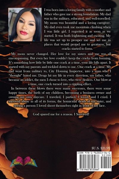 I was born into a loving family with a mother and father who gave me a strong foundation. My dad was in the military, educated, and well-travelled. My mom was beautiful and a loving caregiver. My dad even took me mountain climbing when I was little girl. I regretted it as soon as we started. It was both frightening and exciting. My life was set up to prosper me and set me in places that would propel me to greatness, but cracks started to form. My mom never changed. Her love for my sisters and me was all encompassing. But even her love couldn't keep the cracks from forming. It's something how little by little one crack at a time, your life falls apart. It started with my parents and trickled down to me. One crack at a time. My dad went from military to, City Housing Inspector, into a man who I "thought" hated me. Drugs hit my life in every direction, my father, who became an addict, the men I chose to love, who were dealers. One blow at a time, one crack turned into a rippling effect. In between these blows there were many successes, there were some happy times, the birth of my children, becoming a business owner and owning my own daycare. I traveled, I partied, I loved, and I cried. I survived abuse in all of its forms, the homicidal death of my sister, and seeing a person I loved shoot themselves right in front of my face. God spared me for a reason. I Survived!