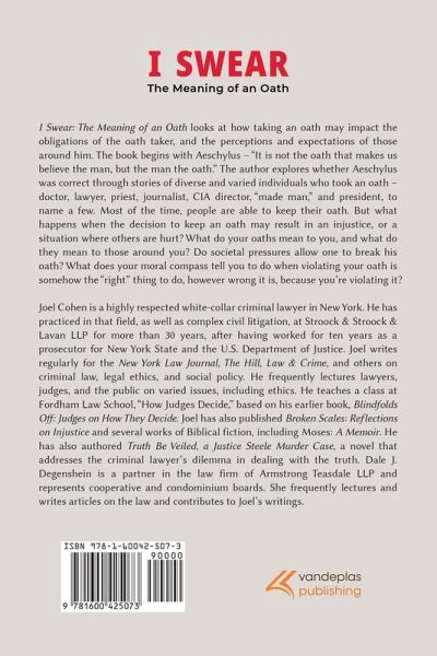 I Swear: The Meaning of an Oath looks at how taking an oath may impact the obligations of the oath taker, and the perceptions and expectations of those around him. The book begins with Aeschylus – "It is not the oath that makes us believe the man, but the man the oath." The author explores whether Aeschylus was correct through stories of diverse and varied individuals who took an oath – doctor, lawyer, priest, journalist, CIA director, "made man," and president, to name a few. Most of the time, people are able to keep their oath. But what happens when the decision to keep an oath may result in an injustice, or a situation where others are hurt? What do your oaths mean to you, and what do they mean to those around you? Do societal pressures allow one to break his oath? What does your moral compass tell you to do when violating your oath is somehow the "right" thing to do, however wrong it is, because you’re violating it?