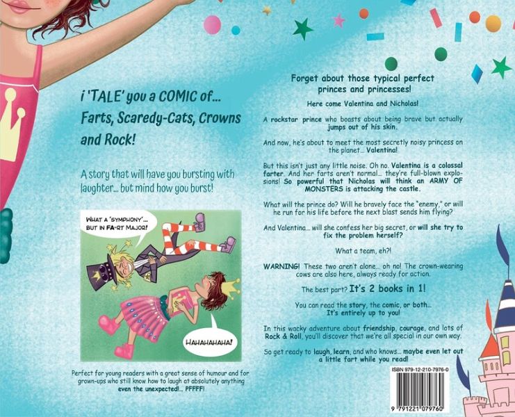 i "TALE" you a COMIC of... Farts, Frights, Crowns and ROCK! Yes, you read that right! A book with farts, frights, and cows with crowns. What more could you ask for? Actually... a lot more! Because this book is 2 in 1: On the left pages: a hilarious story told like a classic tale. On the right: the same story as a comic, with drawings that will crack up even the most serious reader in the kingdom. So, what's this madness about? Valentina is not your typical princess. She's got a little problem... Her farts are supersonic. Explosive. Unforgettable. And just when she's trying to hide it, along comes Nicolás: a rockstar prince who acts all brave but jumps at his own shadow. (Or at the sound of a sneaky fart...) And as if that wasn't enough, there are cows wearing crowns. Yes, real cows. With real crowns. Because this isn't just any book. This is a storycomic like no other! What will you find inside? Named farts. Lots of rock. Cows on a royal mission. Guaranteed laughs (even for grown-ups). And an important message: everyone has their own little weirdness... and that's what makes us special. Perfect for readers aged 6 to 10. To enjoy at bedtime, in the classroom, with friends, or even in the bathroom! Buy it, read it and... get ready to laugh like a royal scaredy-cat! ISBNs by Language: Spanish (EU): 979-12-210-7975-3 - te CUENTO un CÓMIC de... Pedos, Miedicas, Coronas ¡y Rock! Spanish (LATAM): 979-12-210-7977-7 - te CUENTO un CÓMIC de... Pedos, Miedosos, Coronas ¡y Rock! Italian: 979-12-210-7979-1 - ti RACCONTO un FUMETTO di... Scoregge, Fifoni, Corone e Rock! English (US): 979-12-210-7978-4 - i "TALE" you a COMIC of... Farts, Scaredy-Cats, Crowns and Rock! English (UK): 979-12-210-7976-0 - i "TALE" you a COMIC of... Farts, Scaredy-Cats, Crowns and Rock!