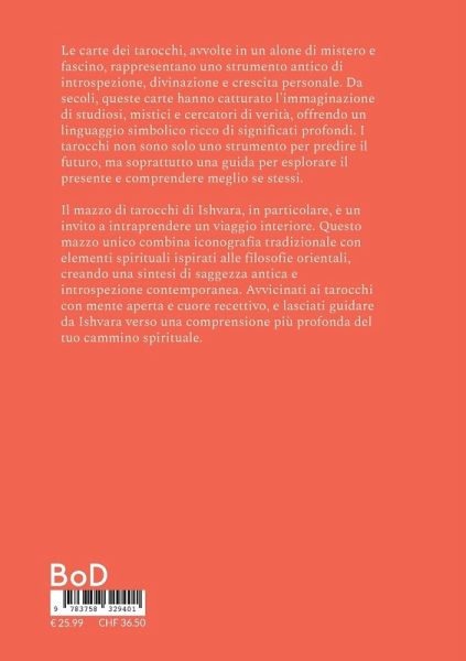 Le carte dei tarocchi, avvolte in un alone di mistero e fascino, rappresentano uno strumento antico di introspezione, divinazione e crescita personale. Da secoli, queste carte hanno catturato l'immaginazione di studiosi, mistici e cercatori di verità, offrendo un linguaggio simbolico ricco di significati profondi.I tarocchi non sono solo uno strumento per predire il futuro, ma soprattutto una guida per esplorare il presente e comprendere meglio se stessi.Il mazzo di tarocchi di Ishvara, in particolare, è un invito a intraprendere un viaggio interiore.Questo mazzo unico combina iconografia tradizionale con elementi spirituali ispirati alle filosofie orientali, creando una sintesi di saggezza antica e introspezione contemporanea. Avvicinati ai tarocchi con mente aperta e cuore recettivo, e lasciati guidare da Ishvara verso una comprensione più profonda del tuo cammino spirituale.