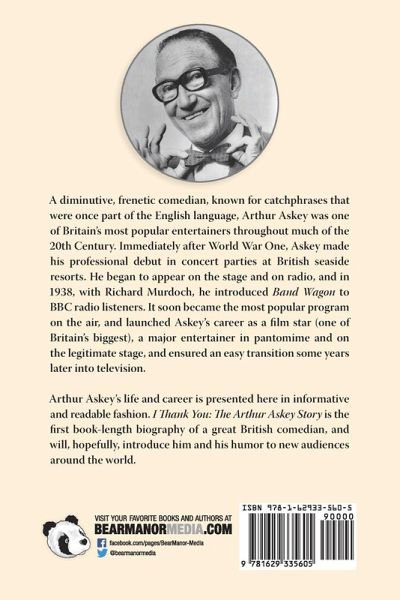 A diminutive, frenetic comedian, known for catchphrases that were once part of the English language, Arthur Askey was one of Britain's most popular entertainers throughout much of the 20th Century. Immediately after World War One, Askey made his professional debut in concert parties at British seaside resorts. He began to appear on the stage and on radio, and in 1938, with Richard Murdoch, he introduced Band Wagon to BBC radio listeners. It soon became the most popular program on the air, and launched Askey's career as a film star (one of Britain's biggest), a major entertainer in pantomime and on the legitimate stage, and ensured an easy transition some years later into television. Arthur Askey's life and career is presented here in informative and readable fashion. I Thank You: The Arthur Askey Story is the first book-length biography of a great British comedian, and will, hopefully, introduce him and his humor to new audiences around the world.