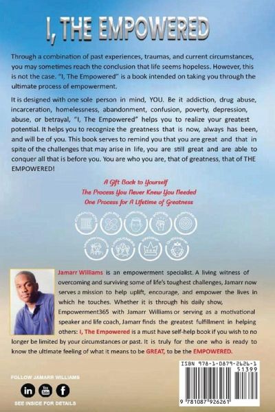 Through a combination of past experiences, traumas, and current circumstances, you may sometimes reach the conclusion that life seems hopeless. However, this is not the case. "I, The Empowered" is a book intended on taking you through the ultimate process of empowerment. It is designed with one sole person in mind, YOU. Be it addiction, drug abuse, incarceration, homelessness, abandonment, confusion, poverty, depression, abuse, or betrayal, "I, The Empowered" helps you to realize your greatest potential. It helps you to recognize the greatness that is now, always has been, and will be of you. This book serves to remind you that you are great and that in spite of the challenges that may arise in life, you are still great and are able to conquer all that is before you. You are who you are, that of greatness, that of THE EMPOWERED!