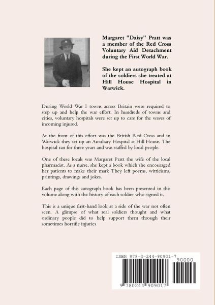 During World War I towns across Britain were required to step up and help the war effort. In hundreds of towns and cities, voluntary hospitals were set up to care for the waves of incoming injured. At the front of this effort was the British Red Cross and in Warwick they set up an Auxillary Hospital at Hill House. The hospital ran for three years and was staffed by local people. One of these locals was Margaret Pratt the wife of the local pharmacist. As a nurse, she kept a book which she encouraged her soldier patients to record their presence. They left poems, witticisms, paintings, drawings and jokes. Each page of this autograph book has been presented in this volume along with the history of each soldier who signed it. This is a unique first-hand look at a side of the war not often seen. A glimpse of what real soldiers thought and what ordinary people did to help support them through their sometimes horrific injuries.