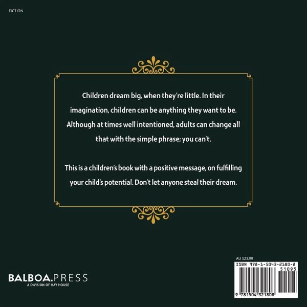 Children dream big, when they're little. In their imagination, children can be anything they want to be. Although at times well intentioned, adults can change all that with the simple phrase; you can't. This is a children's book with a positive message, on fulfilling your child's potential. Don't let anyone steal their dream.